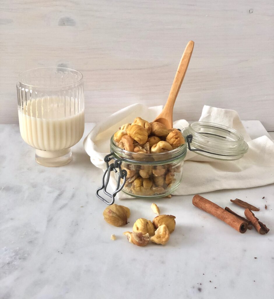 - Colocamos nuestras castañas en un cazo con la leche de mijo y una rama de canela grande. Lo ponemos a hervir a fuego lento sobre 20 minutos aprox.