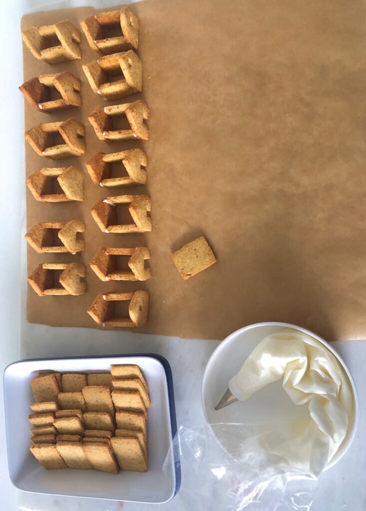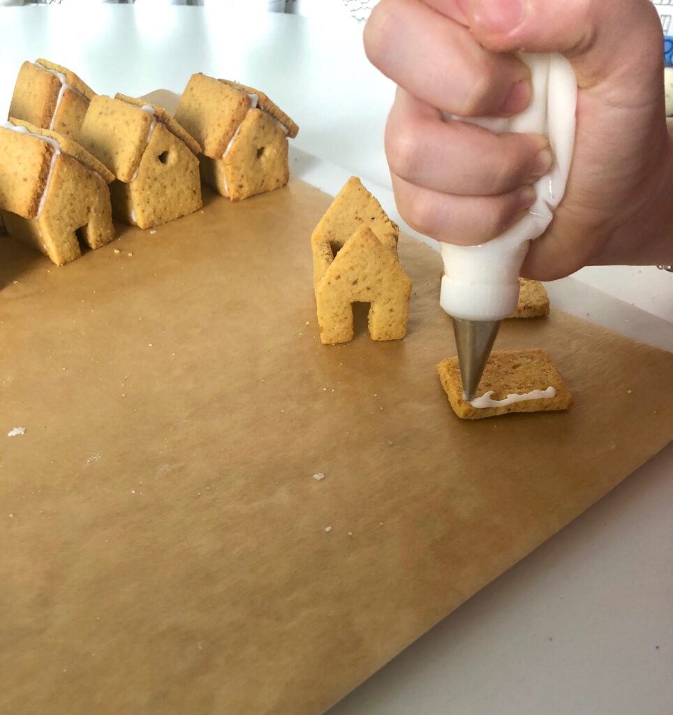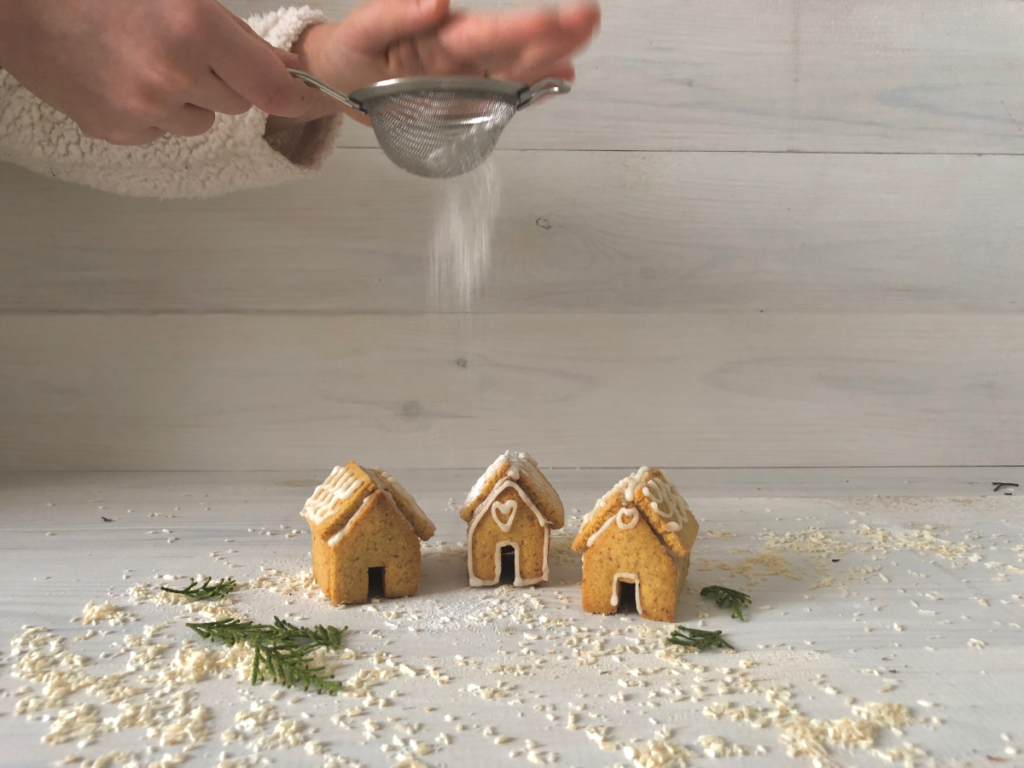 Para pegar las casitas de jengibre y para decorarlas usamos glasa real, intente hacer una glasa real saludable pero no hubo manera, hace tiempo que aparte el azúcar refinado de mi despensa, pero para esta ocasión y después del intento fallido tuve que acudir a ella para finalizar la receta y sobre todo para poder pegar las casitas que Mara tenía tanta ilusión de ver terminadas y como no, con la glasa restante mi tres hijos se pusieron las botas decorando las casas cada uno a su manera y eso fue lo mejor de todo. Así que hay va la receta de la glasa real: