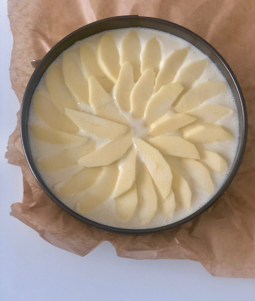 Colocamos en la batidora todos los ingredientes, con tres de las manzanas blancas peladas, reservamos una para decorar nuestra tarta de queso, batimos muy bien los ingredientes, hasta que quede una masa homogénea y después volcamos al molde, yo use uno de 20 cm. desmontable, ahora vais colocando laminas muy finitas de la manzana que habíamos reservado, no se hunde si las hacéis finitas. Ahora horneamos a 180 grados durante 60 minutos aproximadamente, para aseguraros que esta lista pincharla con un palillo, si sale limpio, ya la tendremos para disfrutarla.